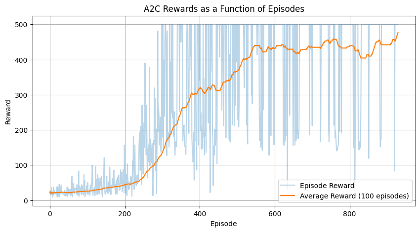 As shown by the figures below, A2C displays a steady improvement with an initial slow learning curve from episodes 0 to 200 with average rewards under 100, followed by a rapid improvement section from episodes 200 to 260 increasing to approximately an average reward of 400, and a final fine-tuning phase from episodes 600 to 930 stabilizing the average reward achieved.