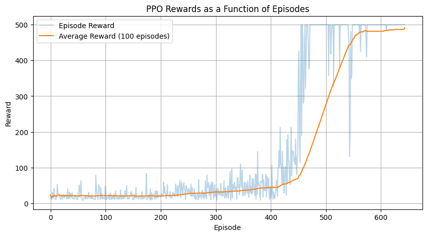 Though PPO solves the CartPole-v1 problem quicker, it has an exploration phase twice as long, from episodes 0 to 400 with consistent low rewards, followed by a steep increase in reward from episodes 200 to 600 with an average reward of approximately 500, and a final fine-tuning phase from episodes 600 to 930.